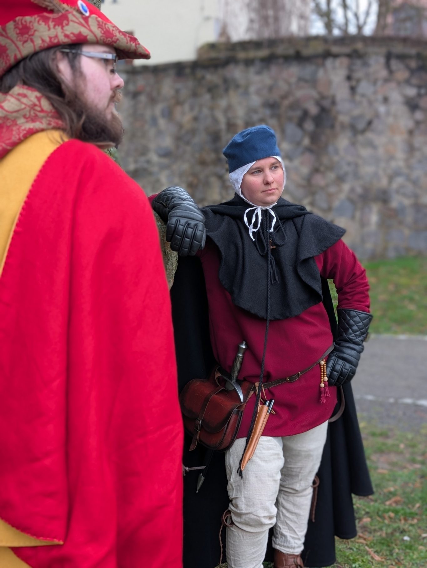 Die weibliche Darstellung orientiert sich an spätmittelalterlicher Alltagskleidung um das Jahr 1470 und zeigt bewusst eine arbeitsorientierte Gewandung, wie sie für körperlich anspruchsvolle Tätigkeiten typisch gewesen sein könnte.