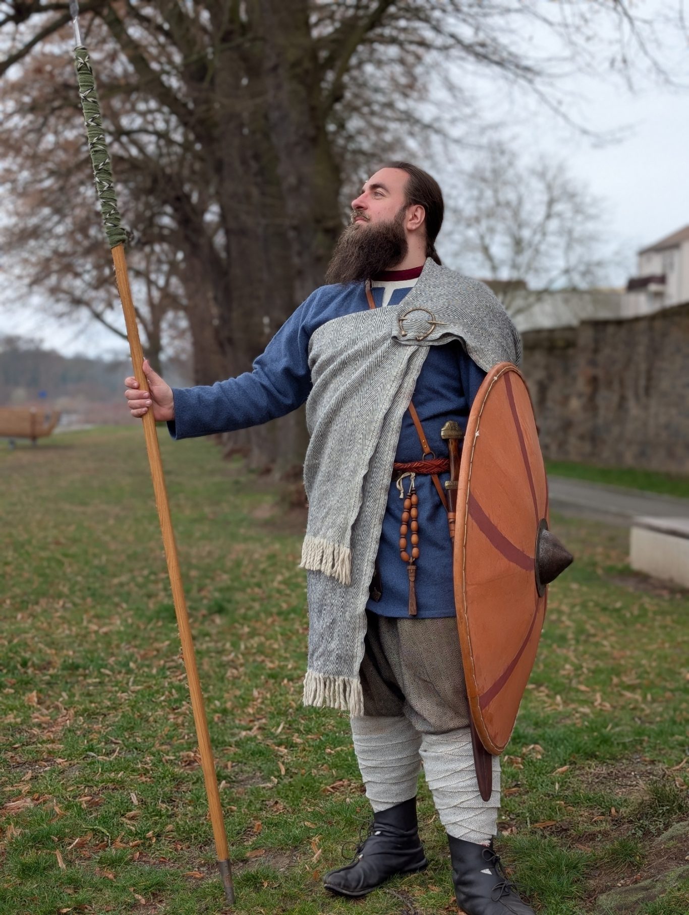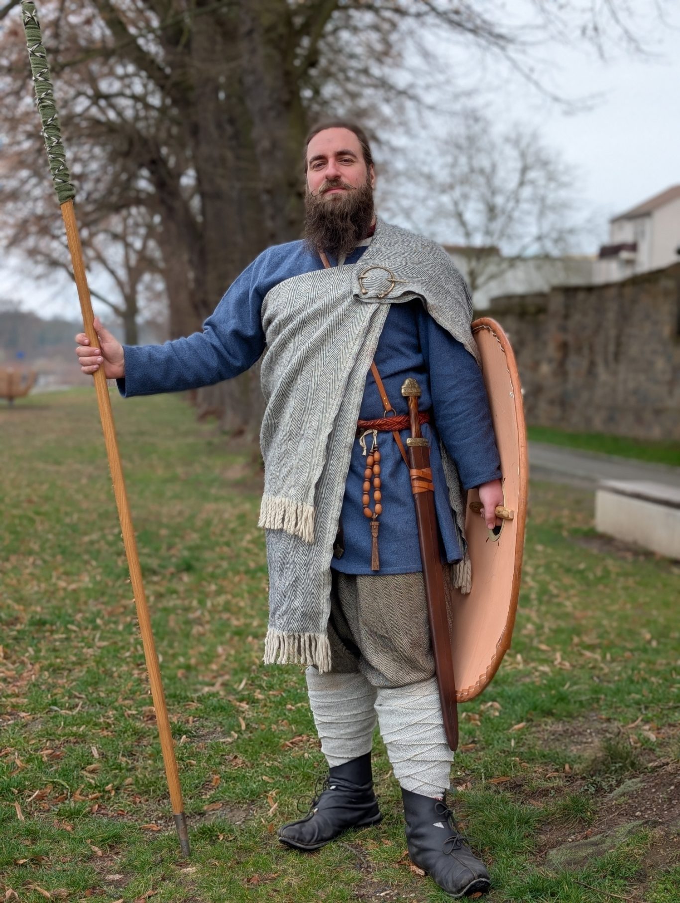 Die Darstellung zeigt typische Elemente dieser Zeit: Wolltunika, Mantel mit Fibel, Gürtel mit Messer sowie Bewaffnung mit Speer, Rundschild und Schwert.