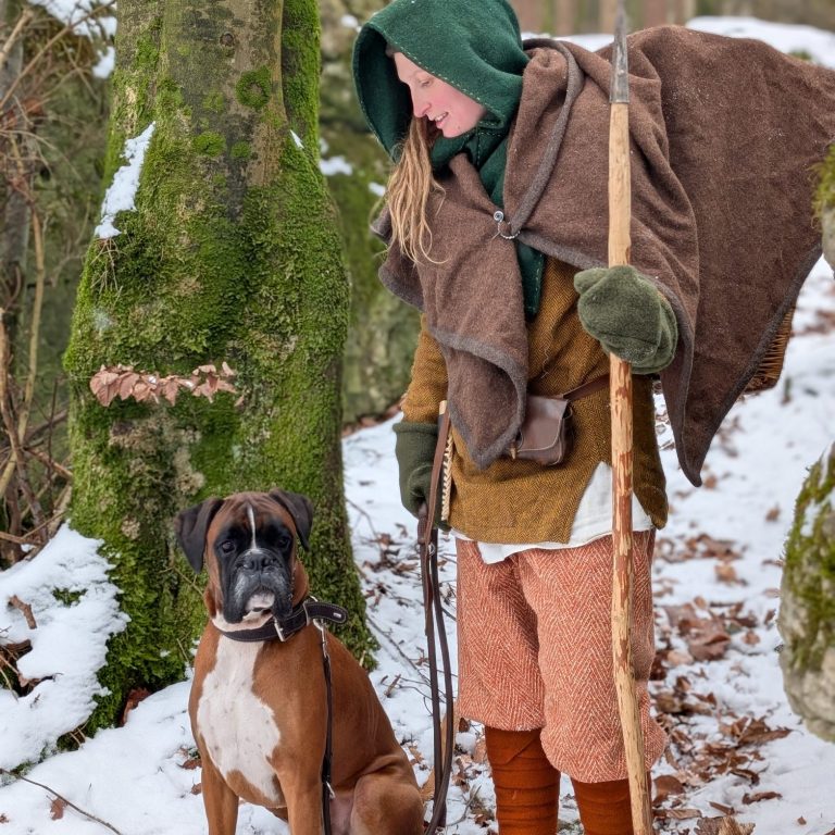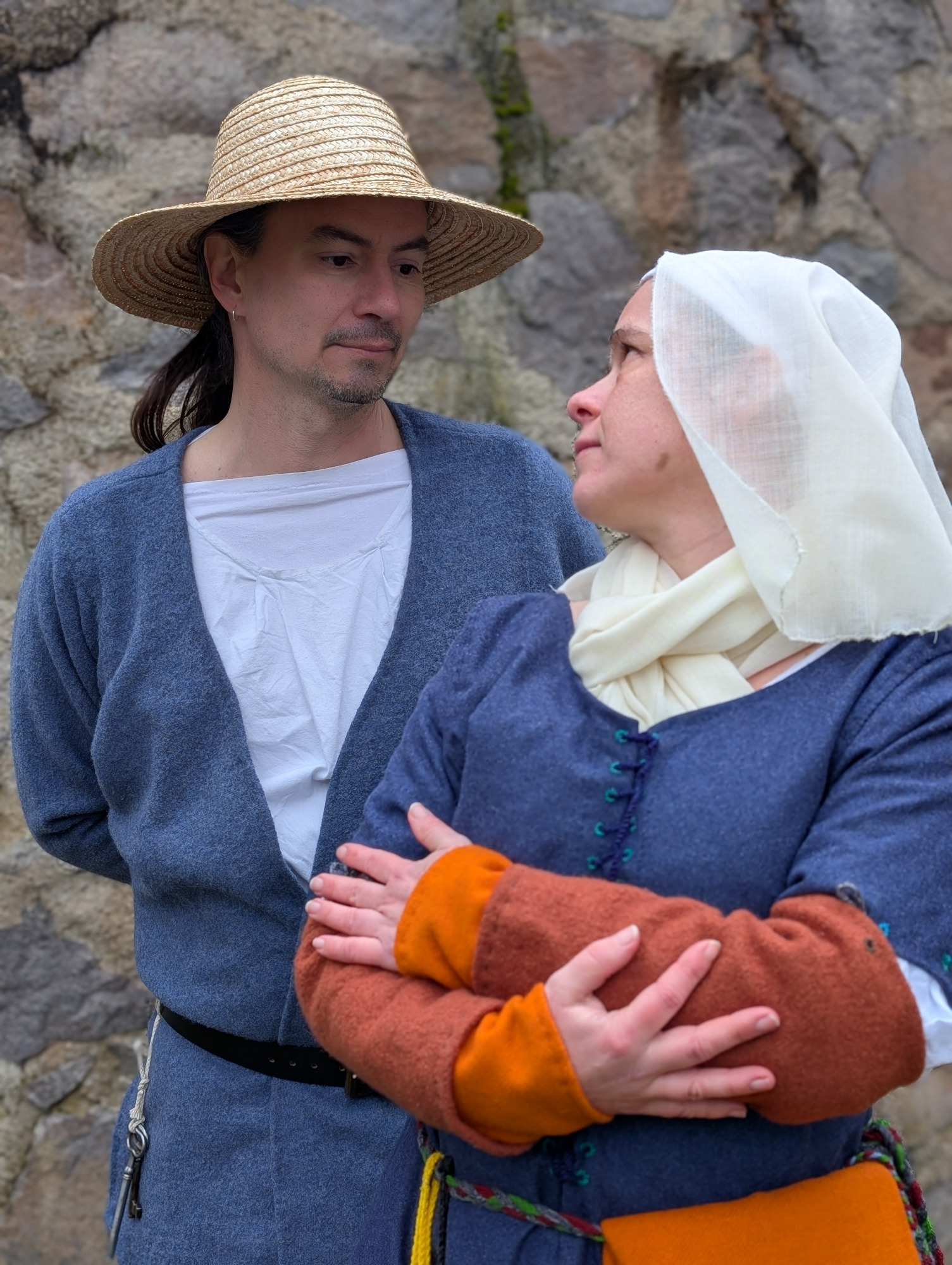 Die weibliche Darstellung orientiert sich an spätmittelalterlicher Alltagskleidung um das Jahr 1470 und zeigt bewusst eine arbeitsorientierte Gewandung, wie sie für körperlich anspruchsvolle Tätigkeiten typisch gewesen sein könnte.