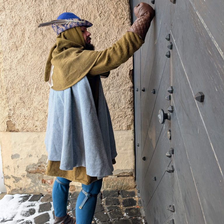 Wie auch bei der weiblichen Darstellung steht die Funktionalität der Kleidung im Vordergrund. Die gewählte Ausführung folgt der Annahme, dass Kleidung im Spätmittelalter nicht nur modischen, sondern vor allem praktischen Anforderungen gerecht werden musste.