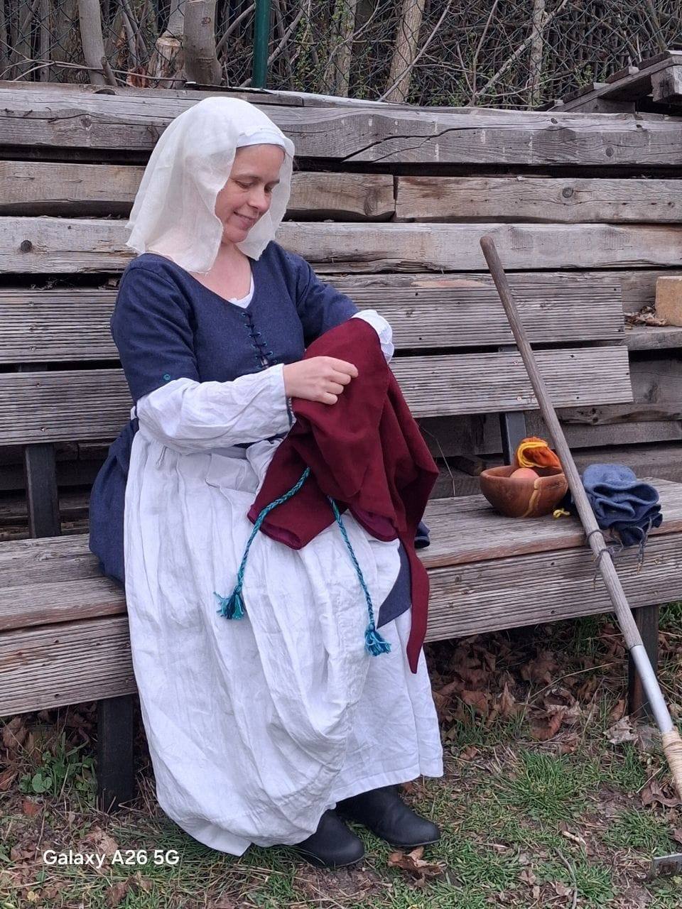 Im Mittelpunkt der Darstellung steht die Überlegung, dass auch im Mittelalter Kleidung in erster Linie funktional und alltagstauglich gewesen sein muss. Die Unterkleidung besteht aus Leinen, Barchent oder Baumwolle, je nach regionaler Verfügbarkeit. Die Oberbekleidung ist aus Wolltuch gefertigt, während stärker beanspruchte oder verschmutzungsanfällige Bereiche bewusst aus Leinen bestehen, da dieses Material leichter zu reinigen ist.