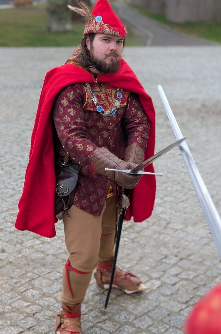 Die Darstellung vermittelt anschaulich, wie ein hochadeliger Fürst wie Wilhelm I., der Einäugige, um das Jahr 1400 gekleidet gewesen sein könnte. Er trägt ein reich verziertes Obergewand aus kostbaren Stoffen in kräftigem Rot, das seinen hohen Rang unterstreicht. Der dekorativ gestaltete Schulterbereich mit goldenen Elementen entspricht der repräsentativen Kleidung des Adels dieser Zeit.
