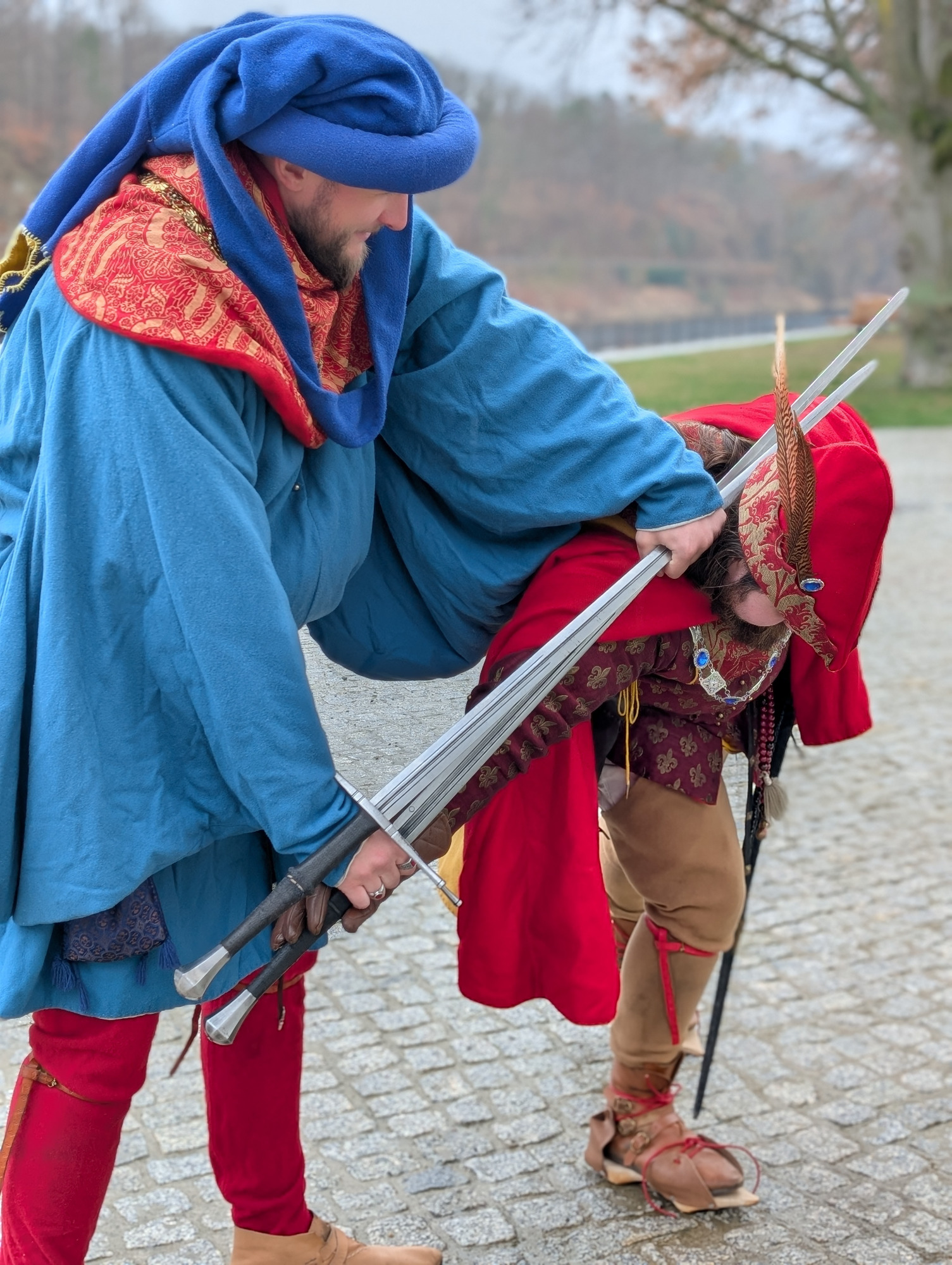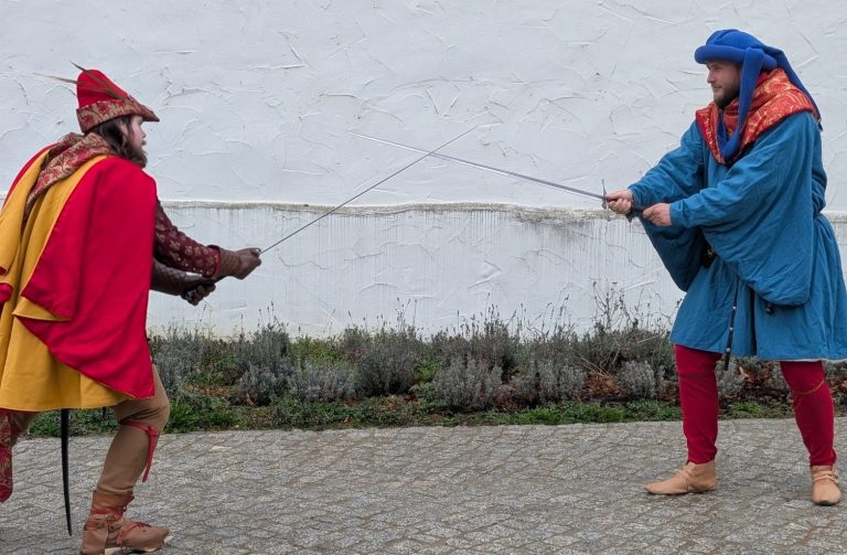 Ergänzend dazu arbeiten wir mit weiteren historischen Quellen, unter anderem von Joachim Meyer, Fiore dei Liberi sowie mit weiteren überlieferten Fechtbüchern und Sammelwerken. Durch den vergleichenden Umgang mit diesen Quellen können unterschiedliche Kampfstile, Techniken und Entwicklungslinien nachvollzogen und anschaulich vermittelt werden.