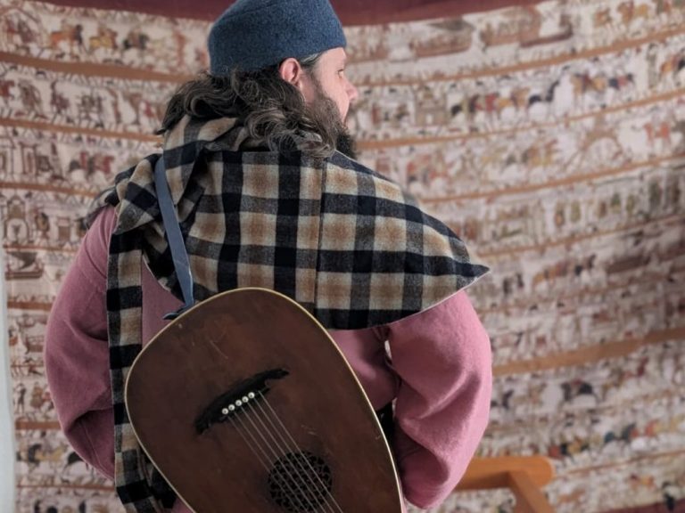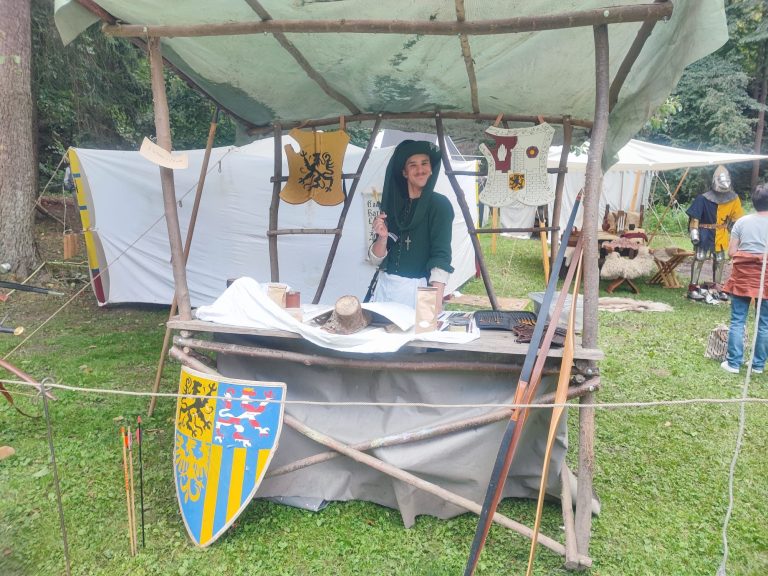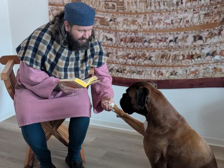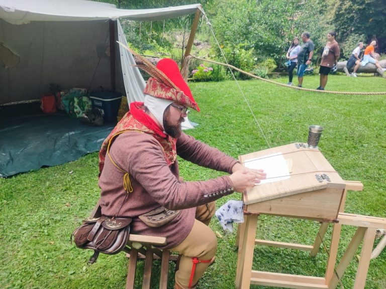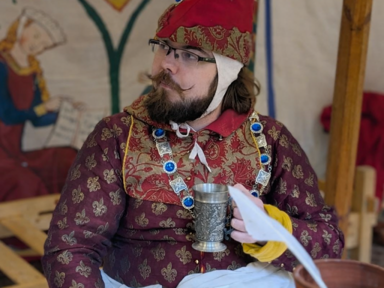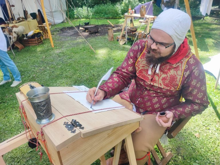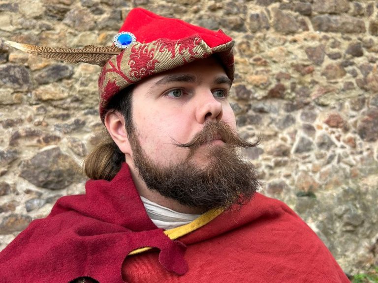 In dieser Darstellung verkörpert unser Domenic einen Ministerialen, der um 1400 als Kanzleischreiber im Dienst eines weltlichen oder geistlichen Herrn tätig ist. Ministeriale entstammten ursprünglich dem unfreien Dienstadel, hatten sich jedoch bis zum späten Mittelalter vielfach zu einem anerkannten niederen Adel entwickelt und übernahmen verantwortungsvolle Aufgaben in Verwaltung und Recht. Als Kanzleischreiber war der Ministerialer Teil der herrschaftlichen Kanzlei. Zu seinen Tätigkeiten gehörten das Abfassen von Urkunden und Briefen, das Führen von Registern und Rechnungen sowie die schriftliche Vorbereitung rechtlicher Vorgänge. Schreib- und Lesefähigkeit, organisatorisches Geschick und ein sicheres Auftreten waren grundlegende Voraussetzungen für dieses Amt.