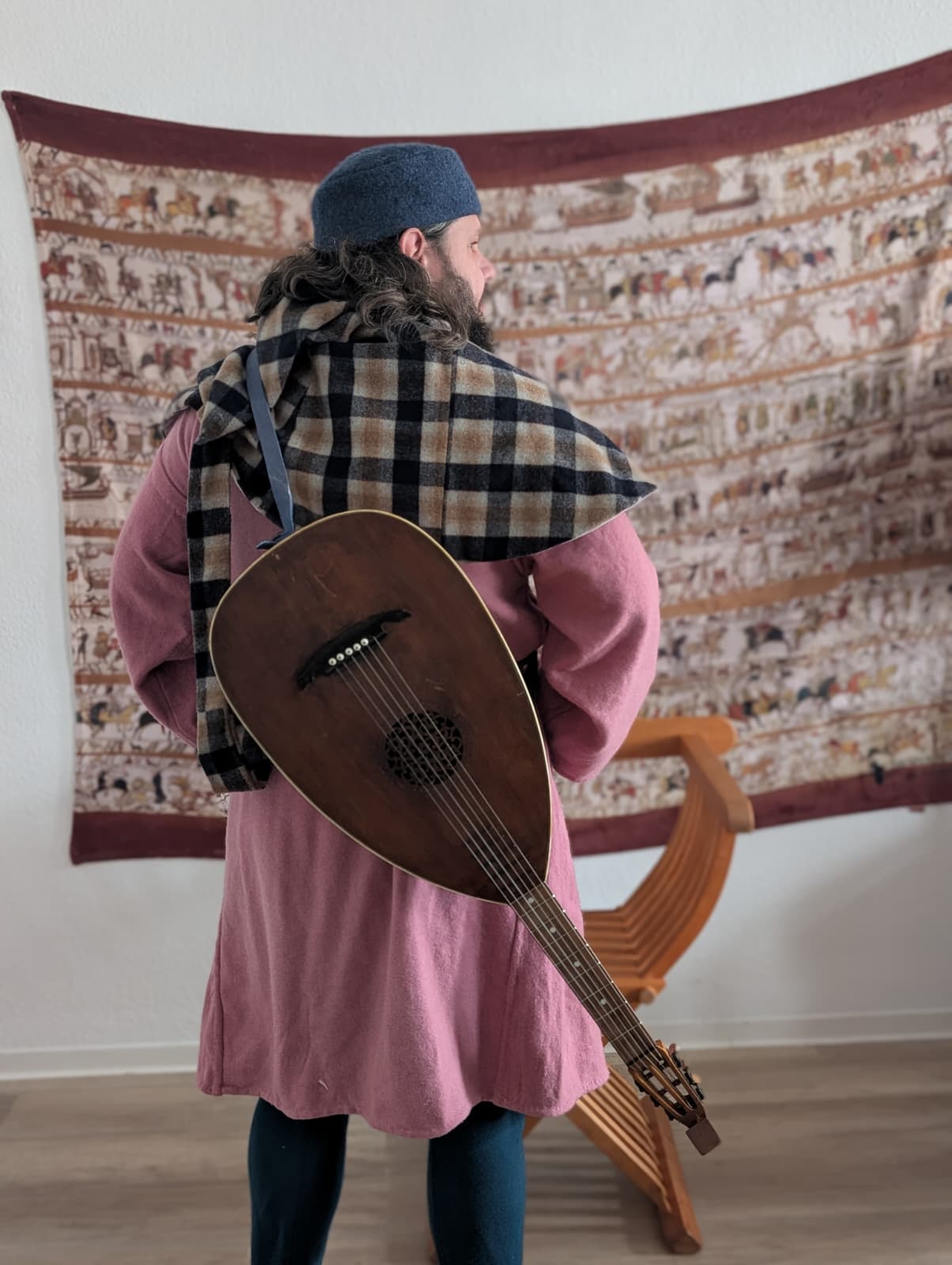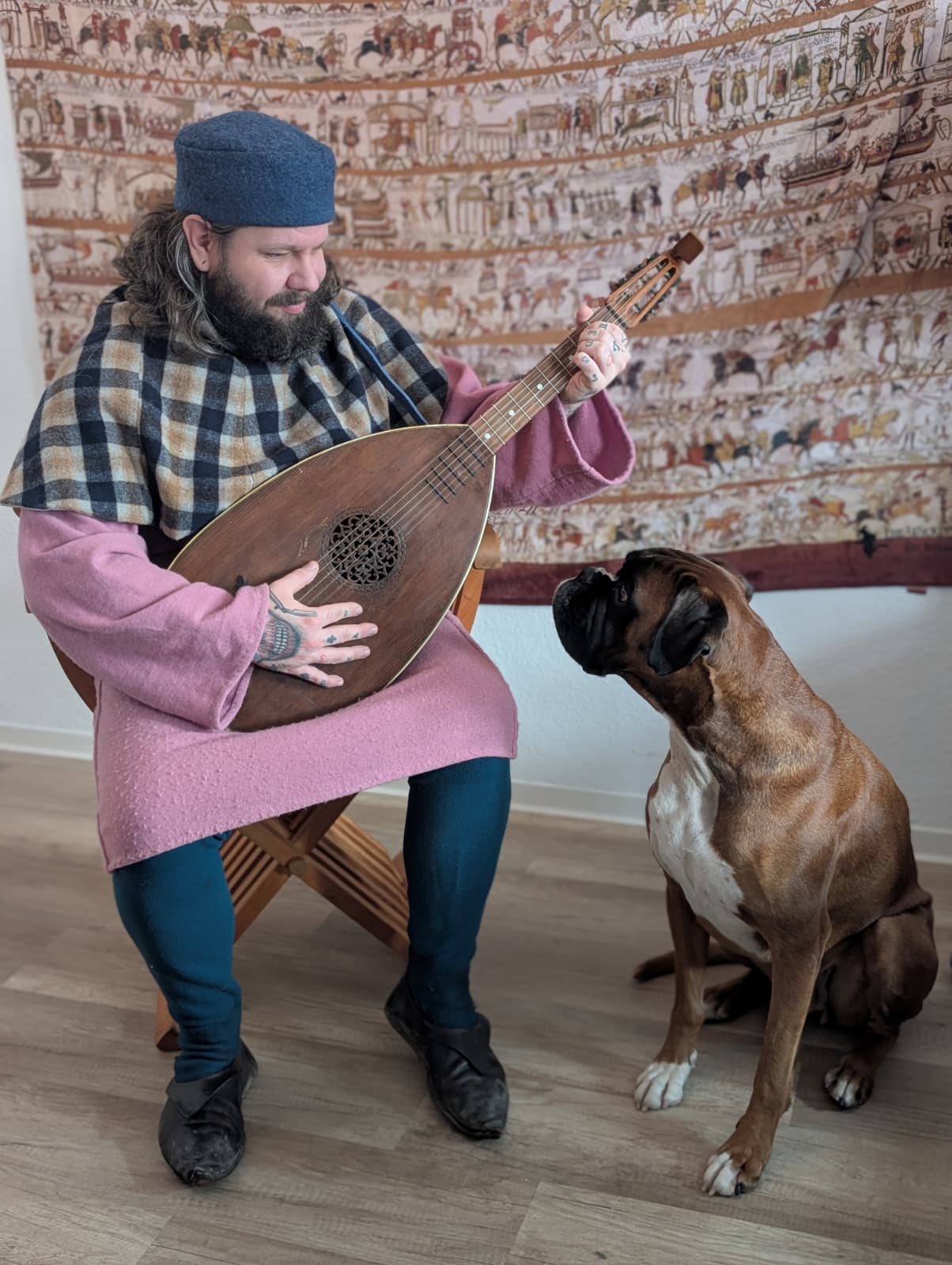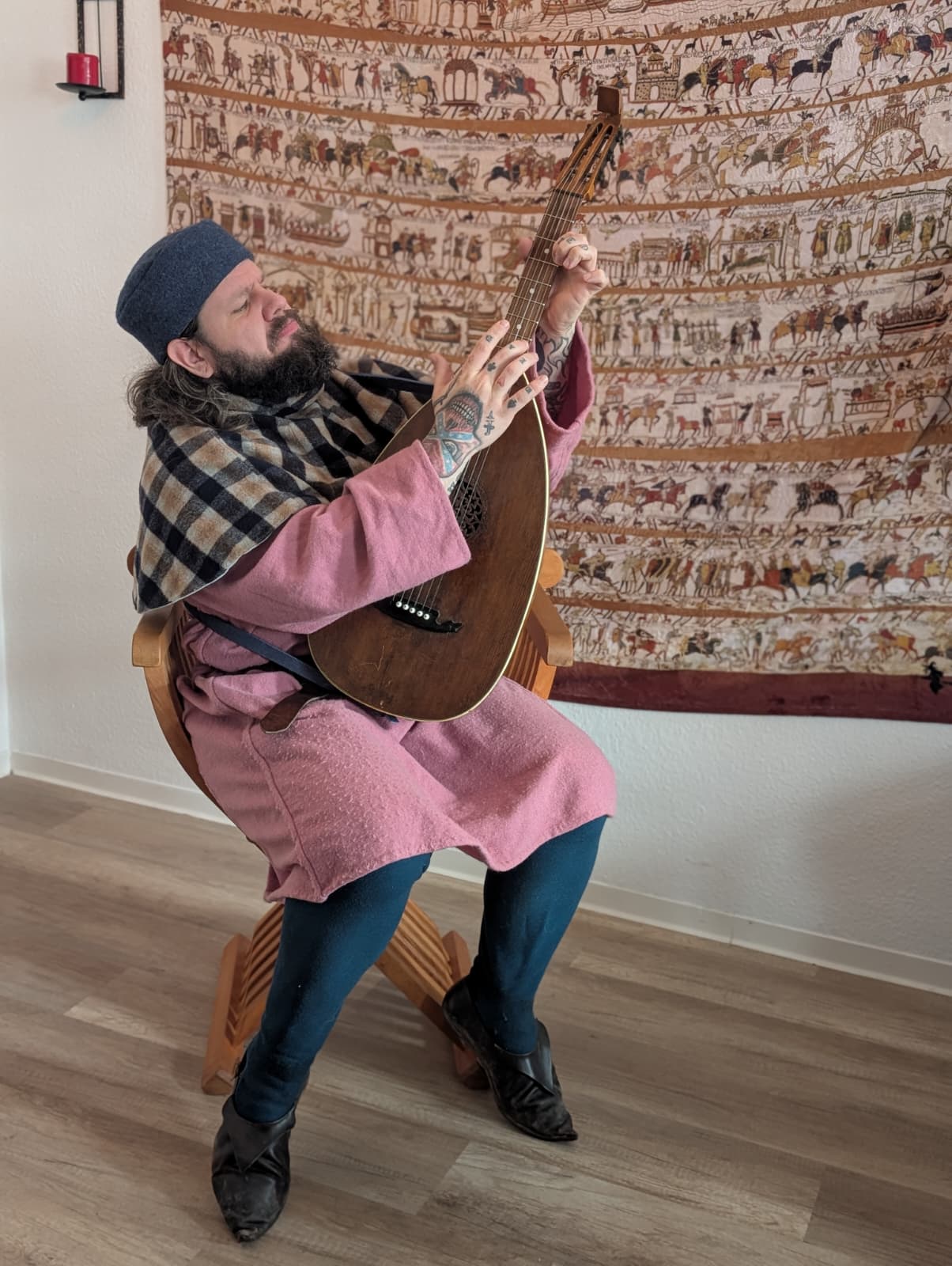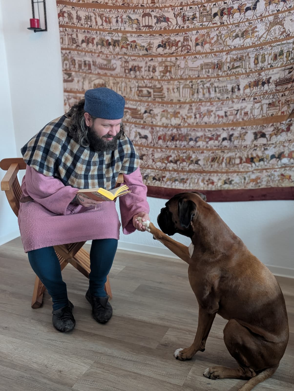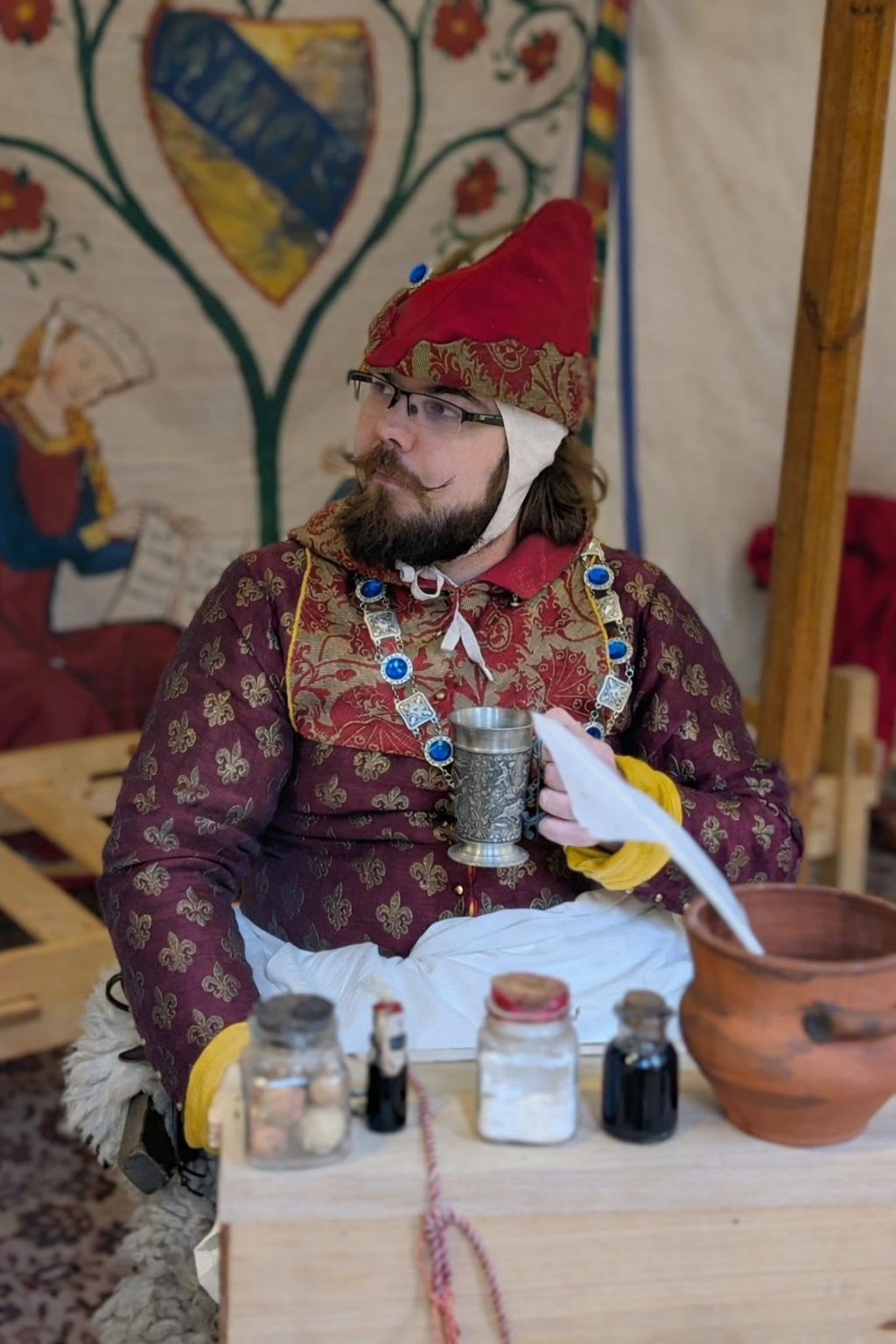 In dieser Darstellung verkörpert unser Domenic einen Ministerialen, der um 1400 als Kanzleischreiber im Dienst eines weltlichen oder geistlichen Herrn tätig ist. Ministeriale entstammten ursprünglich dem unfreien Dienstadel, hatten sich jedoch bis zum späten Mittelalter vielfach zu einem anerkannten niederen Adel entwickelt und übernahmen verantwortungsvolle Aufgaben in Verwaltung und Recht. Als Kanzleischreiber war der Ministerialer Teil der herrschaftlichen Kanzlei. Zu seinen Tätigkeiten gehörten das Abfassen von Urkunden und Briefen, das Führen von Registern und Rechnungen sowie die schriftliche Vorbereitung rechtlicher Vorgänge. Schreib- und Lesefähigkeit, organisatorisches Geschick und ein sicheres Auftreten waren grundlegende Voraussetzungen für dieses Amt.