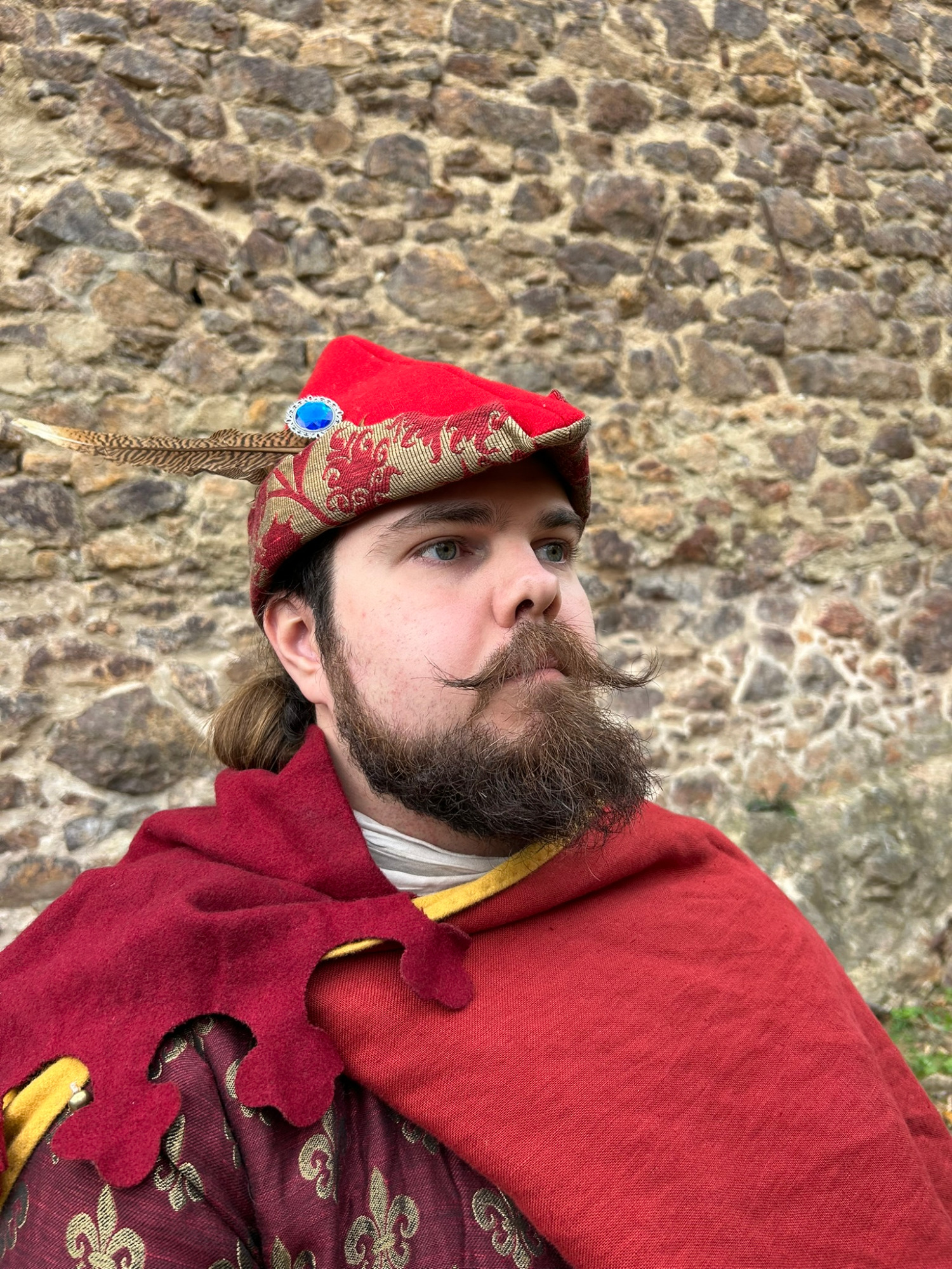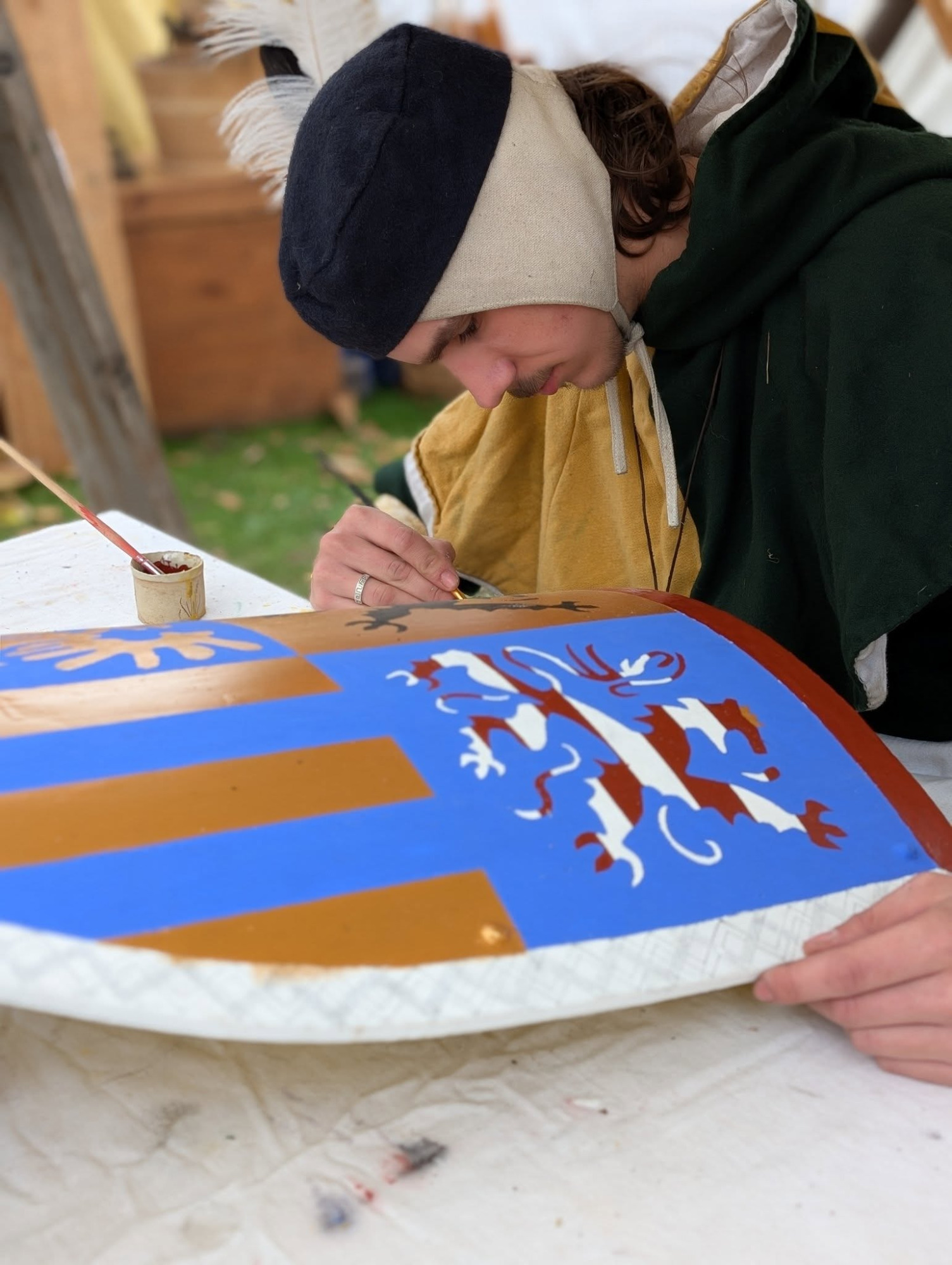 In dieser Darstellung verkörpert Richard einen Schildmaler im deutschsprachigen Raum um das Jahr 1400. Der Schildmaler war ein spezialisierter Handwerker, der Schilde mit Wappen, Farben und Zeichen versah und damit maßgeblich zur Identität und Repräsentation seines Auftraggebers beitrug. Schildmaler arbeiteten für Ritter, Ministeriale, niederadlige Gefolgsleute, Städte und geistliche Herren. Ihre Erzeugnisse dienten sowohl dem Einsatz im Kampf als auch repräsentativen Zwecken, etwa bei Turnieren, feierlichen Aufzügen oder zur Ausstattung von Rüstkammern. Die Gestaltung folgte festen heraldischen Regeln, erforderte jedoch zugleich handwerkliche Präzision und ein sicheres Gespür für Proportion und Farbwirkung.