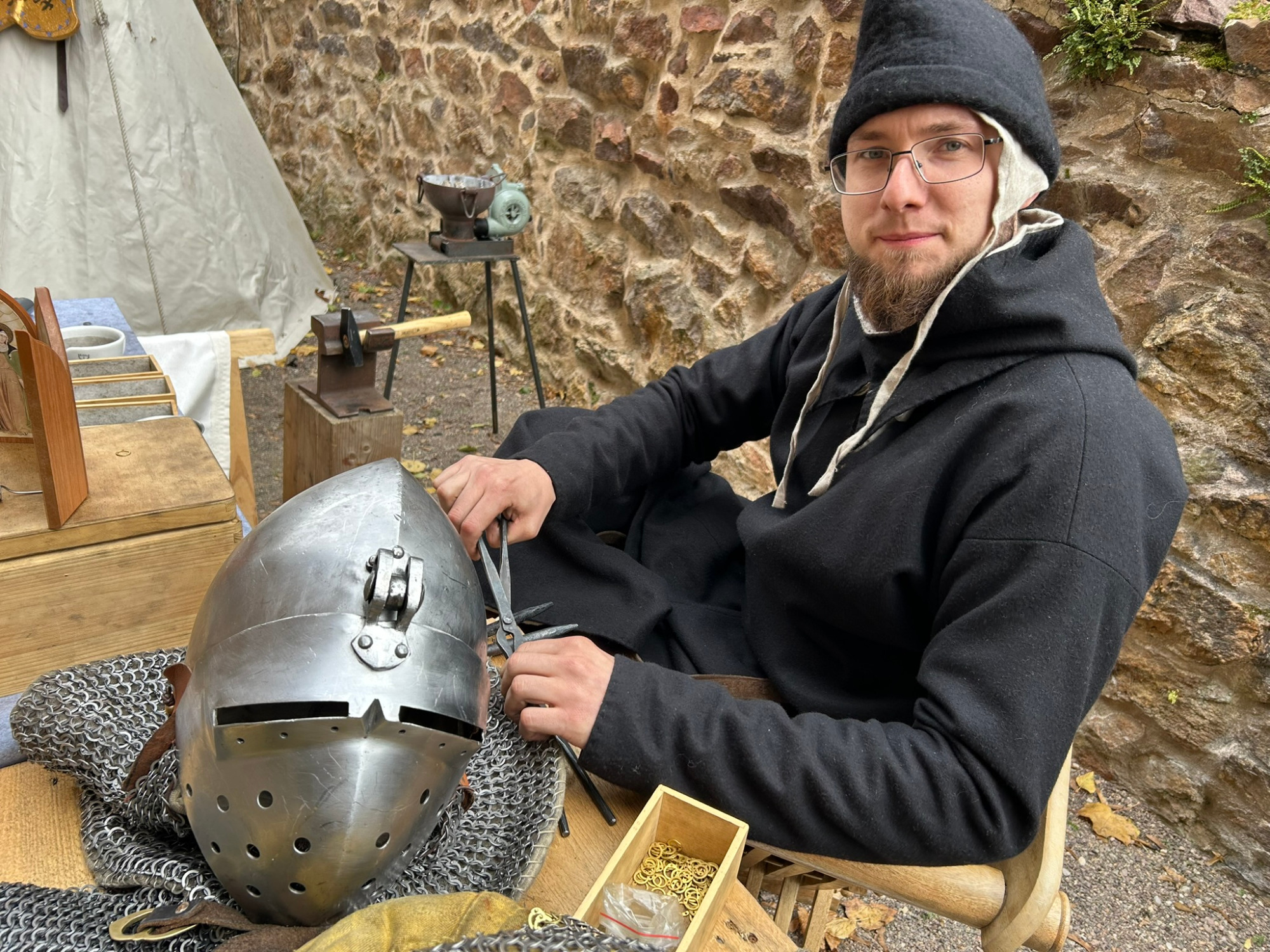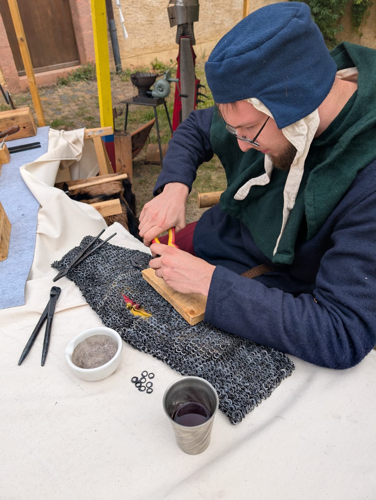 Paul hat es sich zur Aufgabe gemacht, möglichst viele Aspekte dieses Handwerks nach besten Kräften nachzuvollziehen. Dazu gehören sowohl das Flechten und Anpassen von Ringpanzern als auch die Arbeitsschritte vom Draht bis zum fertigen Ring. Besonders faszinierend ist für ihn die Möglichkeit, eines der zentralen Symbole des mittelalterlichen Kriegerstandes selbst herzustellen – ein Ausrüstungsstück, das in seiner Bedeutung dem Schwert kaum nachstand. Darüber hinaus steht für ihn der praktische Nutzen im Vordergrund: einen Gegenstand zu fertigen, der seinem Träger im besten Fall das Überleben auf dem Schlachtfeld ermöglichen konnte. Ein korrekt angepasster Ringpanzer soll dabei nicht nur gut aussehen, sondern funktionieren, sich bewegen lassen und „arbeiten“, wie es historische Vorbilder taten.